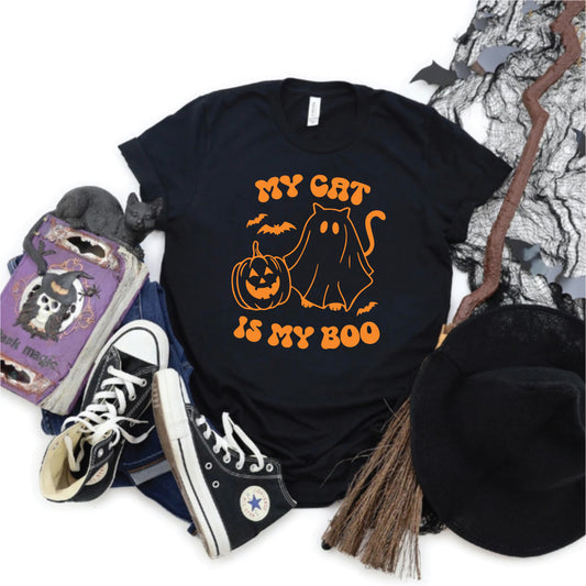 Spooky Ghost Cat Tee - Ideal Halloween Gift for Pet Lovers, Perfect October Outfit, My Cat is My Boo Shirt,Ghostly Cat Halloween T-Shirt - Trendy Fall Fashion for Cat Owners, Unique Pumpkin and Bat Design