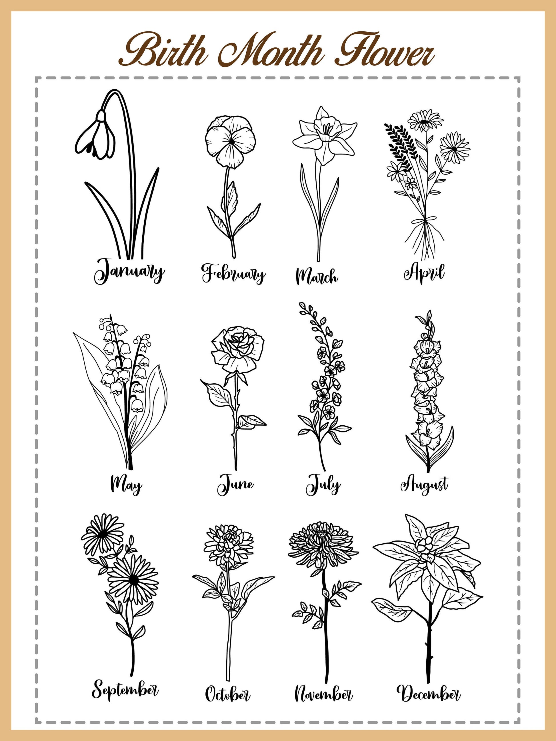 Flowers are Carnation, violet, daffodil, daisy, lily of the valley, rose, water lily, poppy, morning glory, cosmos, chrysanthemum, and holly berry