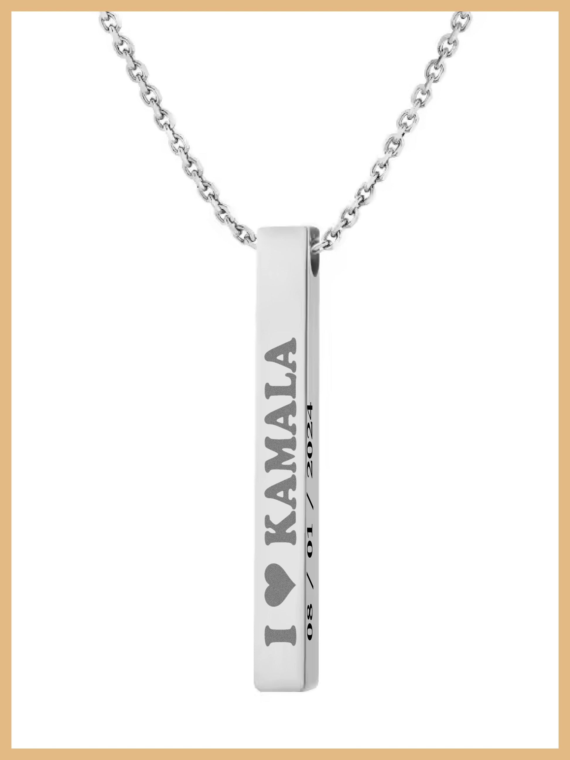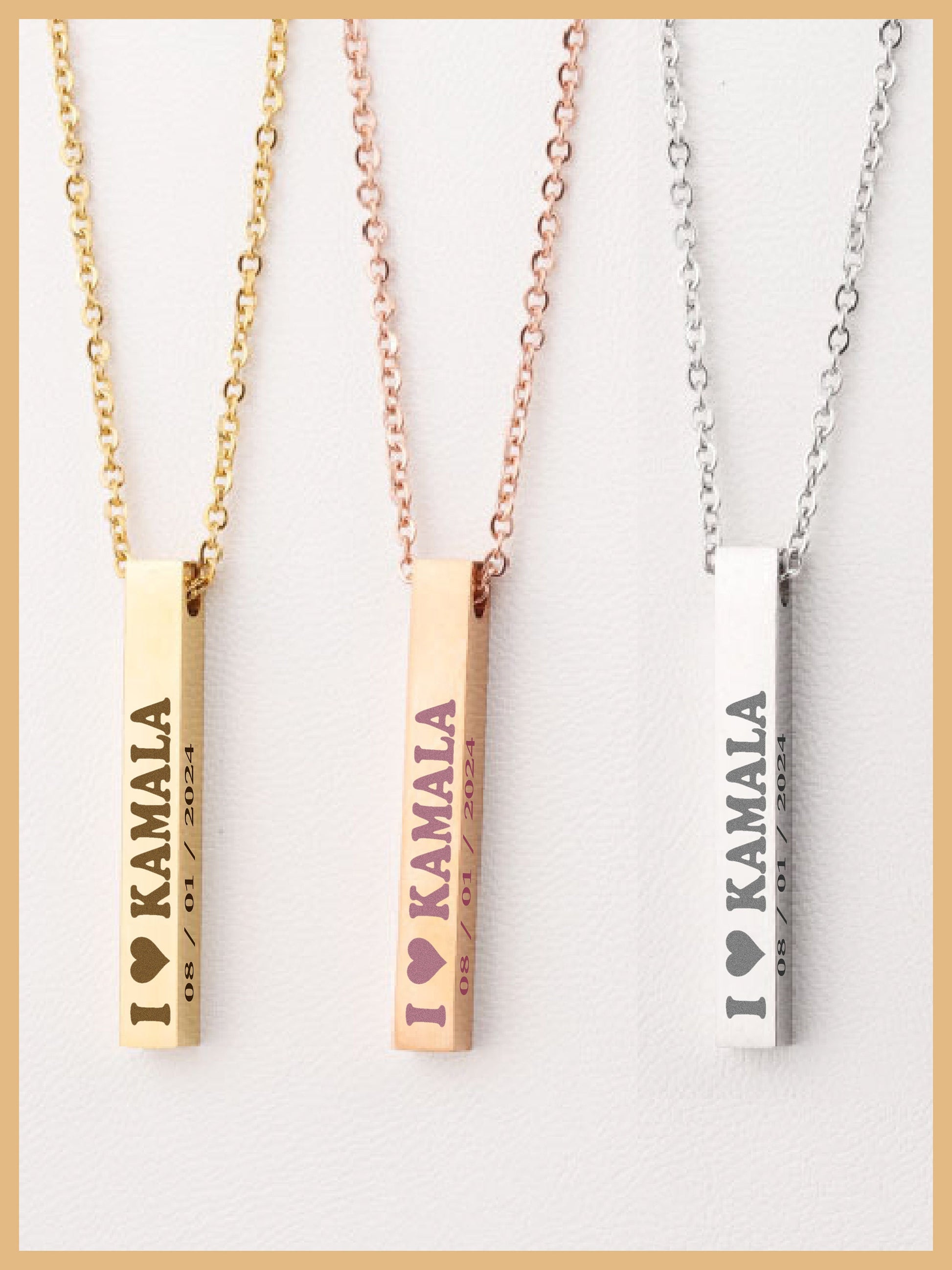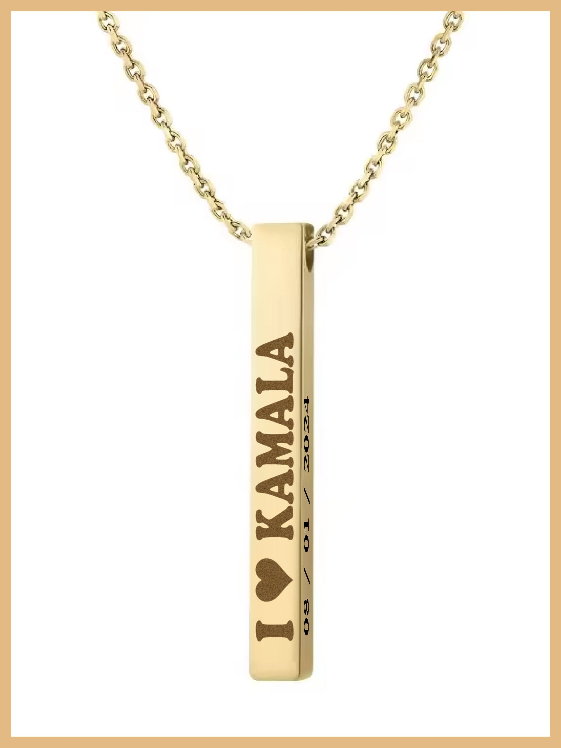 This Personalized Minimalist Necklace is a tribute to the inspiring Kamala Harris and makes a perfect piece of Political Jewelry. This sleek Vertical Name Bar Necklace is a beautiful way to show your support and admiration. Crafted from durable Stainless Steel, this Mother Necklace Gift is sure to be cherished for years to come. Give this unique piece as a Birthday gift or treat yourself to a stylish accessory that carries a meaningful message. Add a touch of elegance and empowerment to your style with this Kamala Harris inspired necklace.