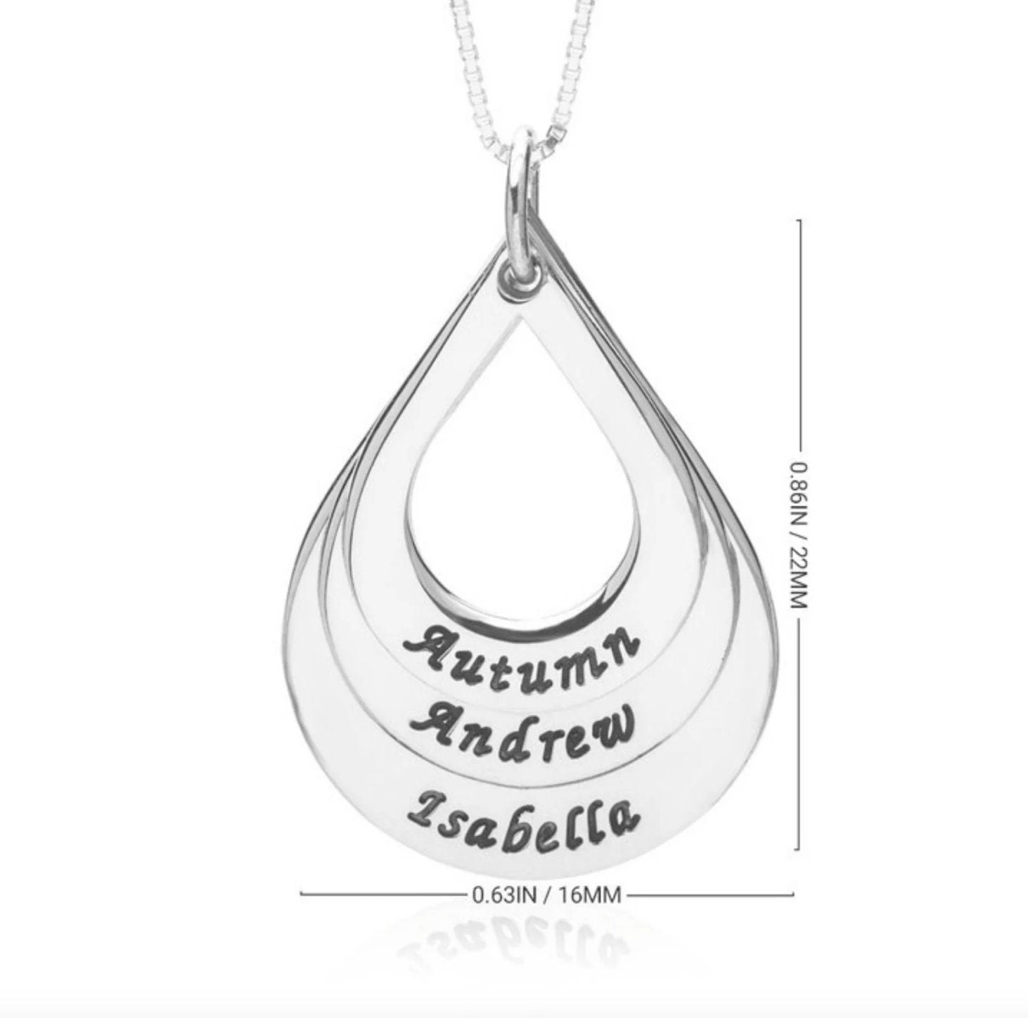 Celebrate the love of family with our Engraved 3 Drop Pendants necklace, perfect as a Mother's Day or Valentine's Day gift. This Custom Family Jewelry features three water drop pendants, each with a name engraved on it. A beautiful and sentimental piece that will be cherished for years to come. Personalize this unique necklace with your family's names and create a one-of-a-kind gift for that special someone.