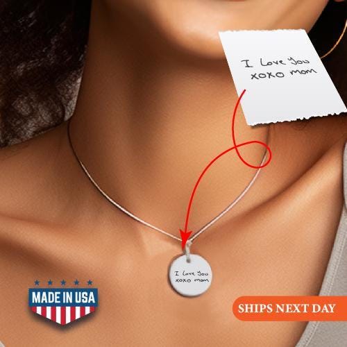 custom handwriting necklace, memorial signature jewelry, sentimental gift for her, holiday keepsake necklace, actual handwriting pendant, engraved disc necklace, personalized memory jewelry, gift for mom or wife, meaningful holiday gift, custom gold necklace