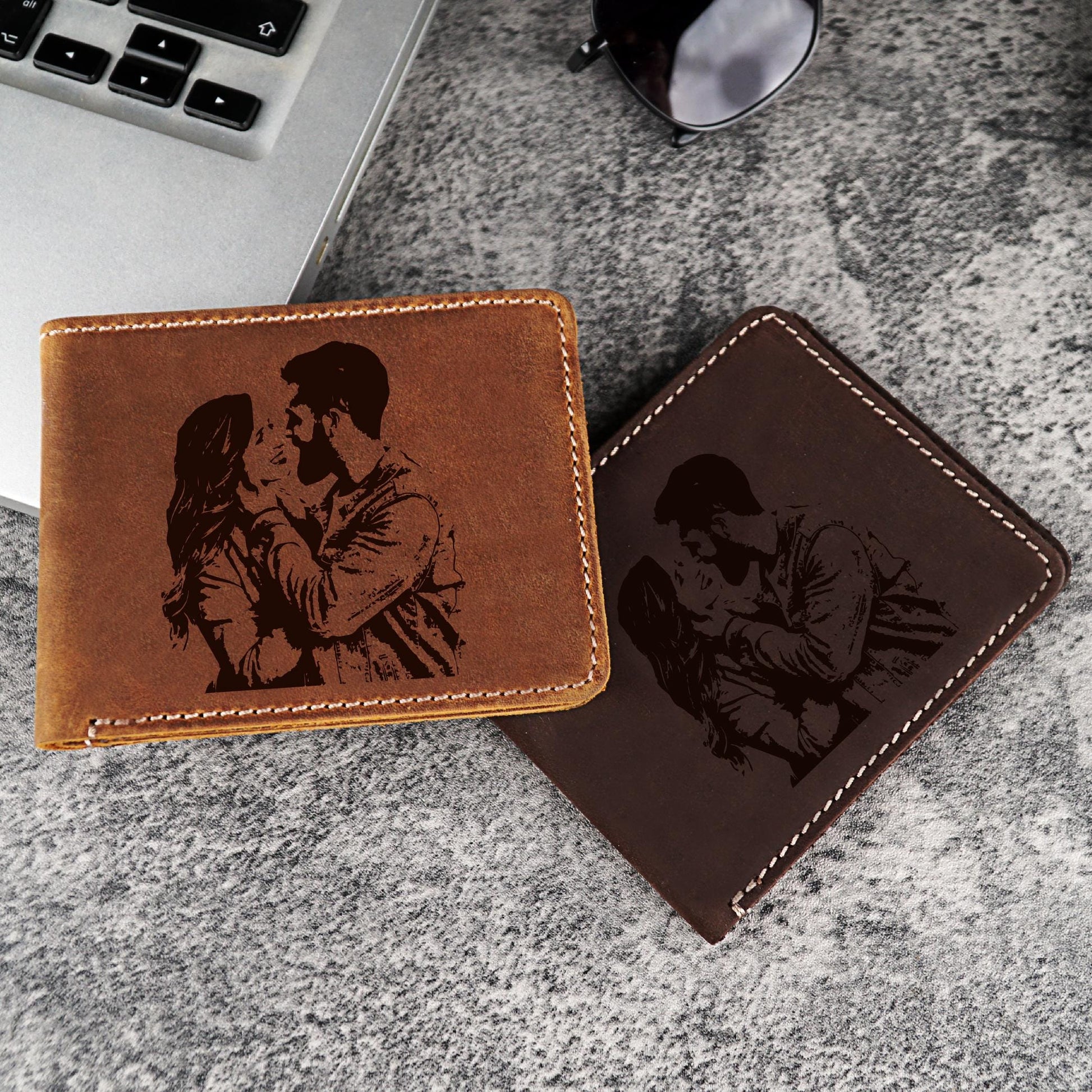 Looking for the perfect personalized gift for the man in your life? This custom photo wallet is a thoughtful and unique option. Crafted from high-quality leather, this personalized men's wallet features a custom engraving of a special photo, making it a wonderful memory anniversary gift. Whether it's a cherished moment captured in time or a meaningful image, this custom photo wallet is sure to be treasured for years to come. Add a personal touch to his everyday essentials with this custom engraved leather wallet.